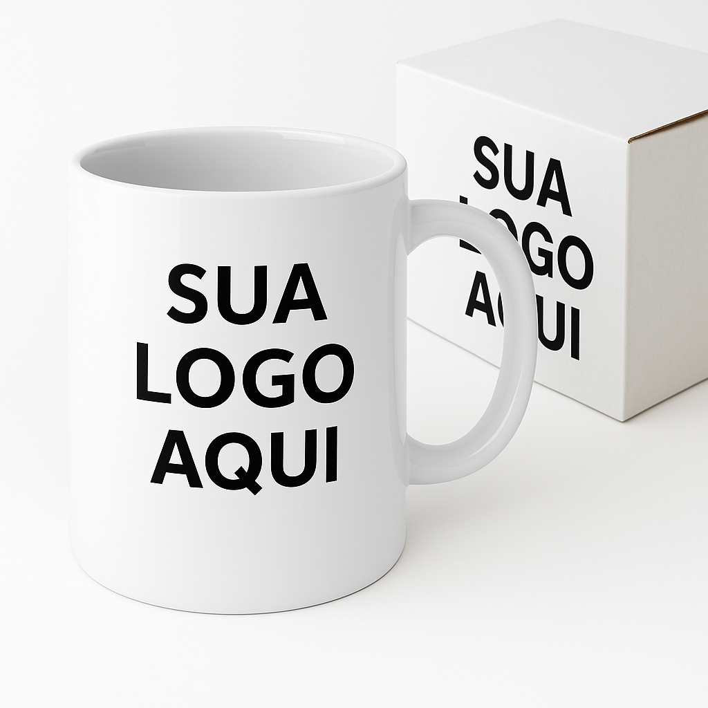 CANECA CERÁMICA BRANCA 300 ml. – C/2 Personalizações Coloridas (Caneca e na Caixa).